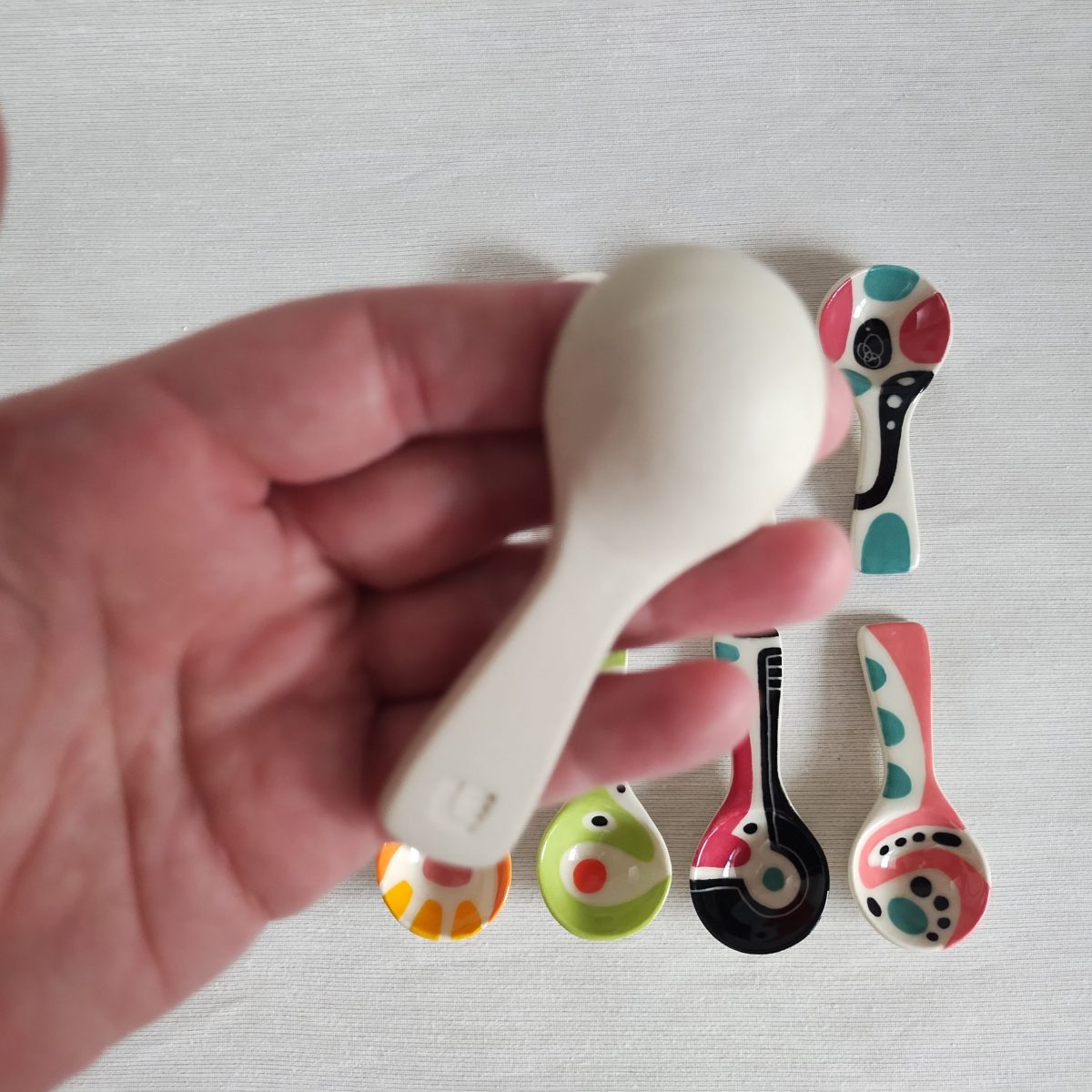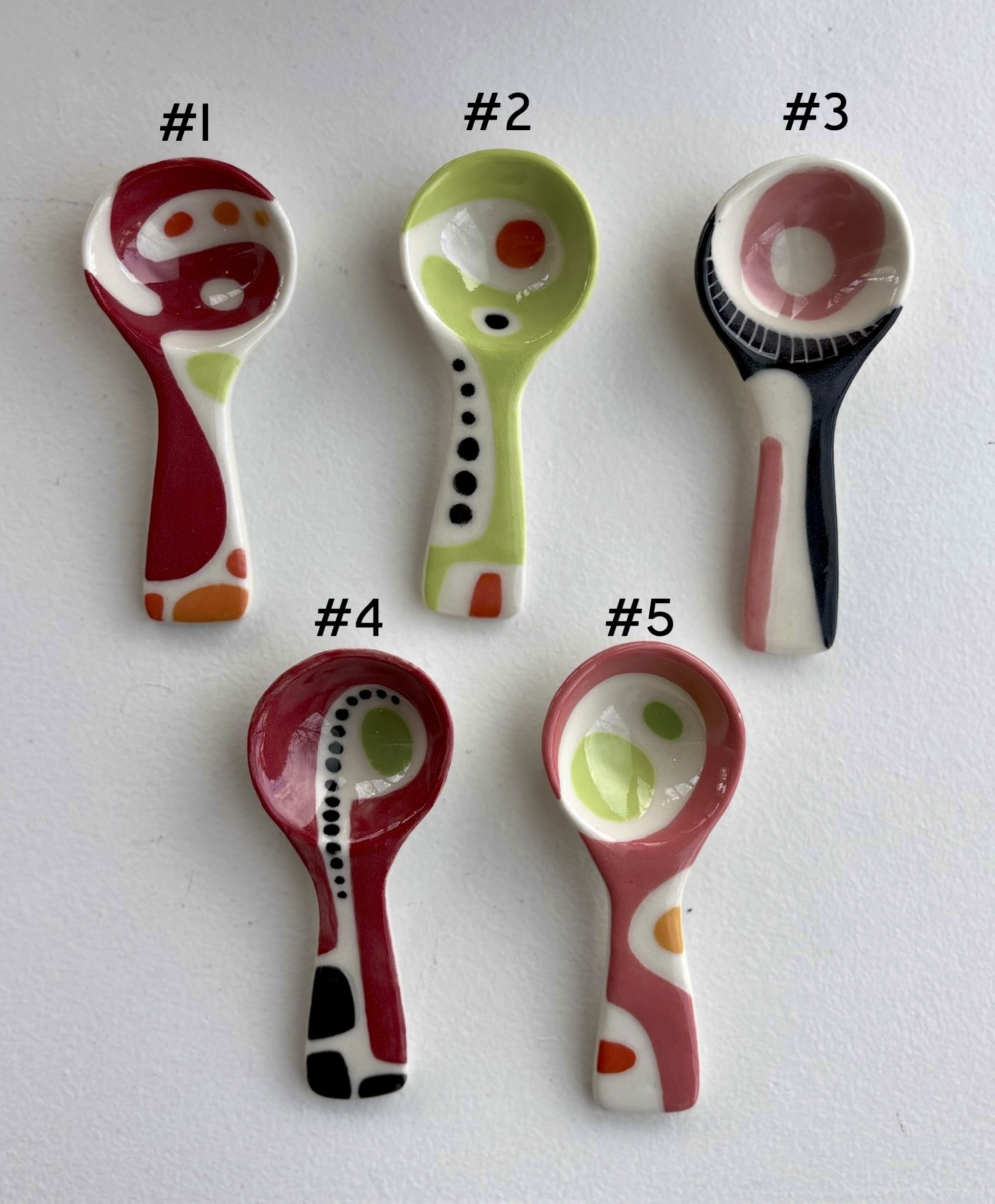 Hand built and hand painted colourful coffee spoons. Each spoon a one-of-a-kind functional piece of art by the talented Lori Elling, out of Burnaby, BC, Canada.