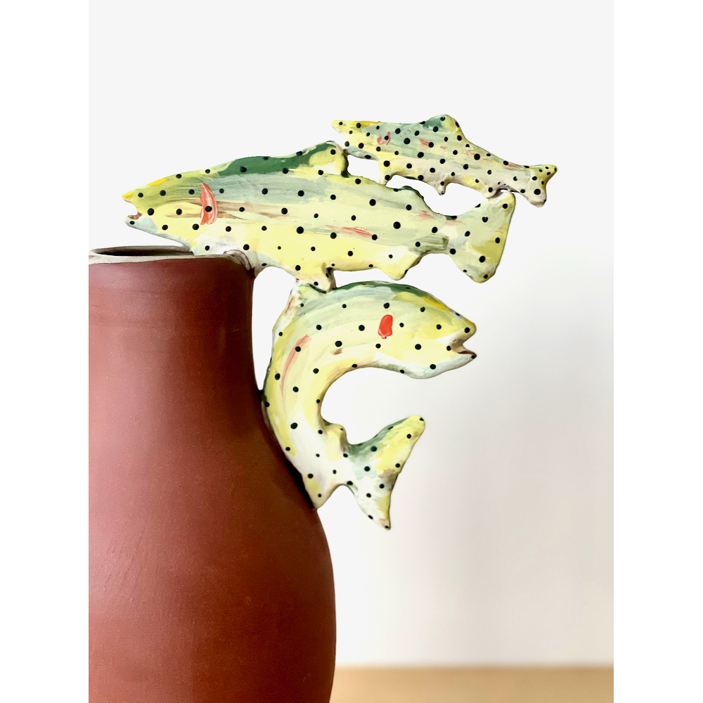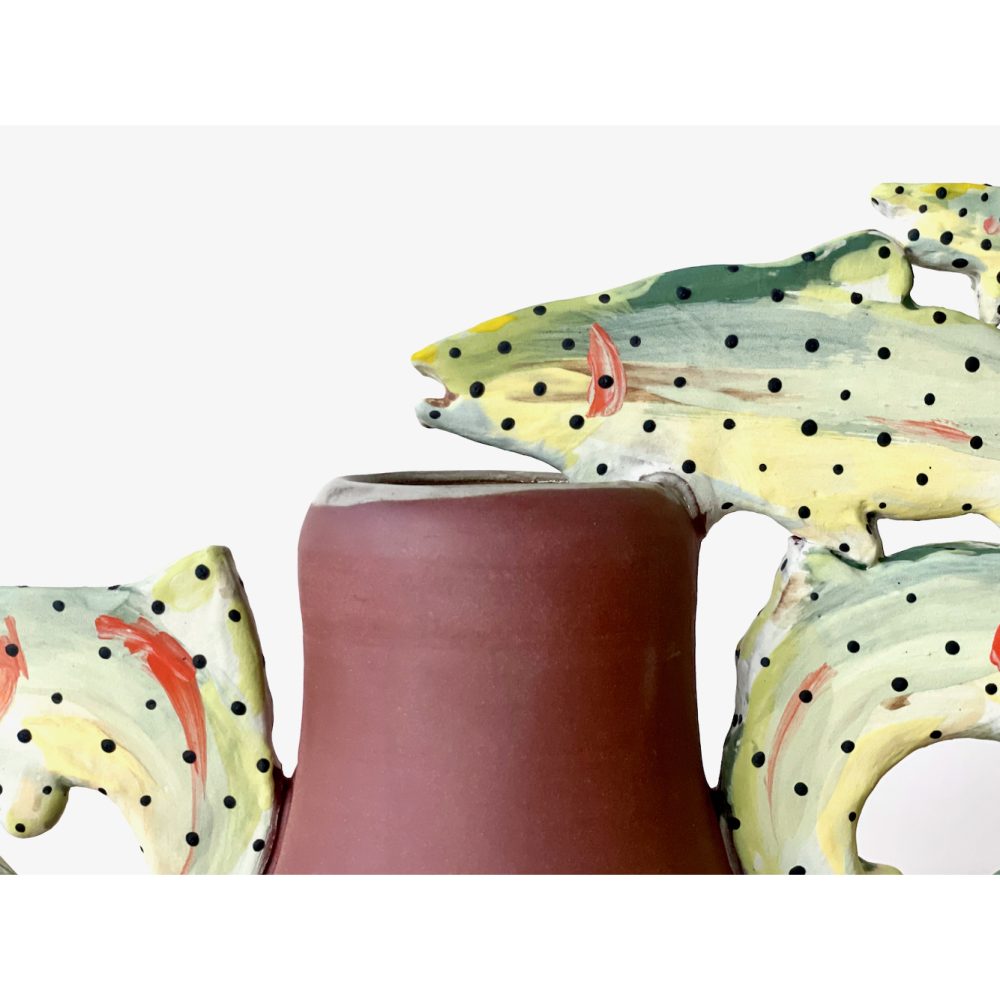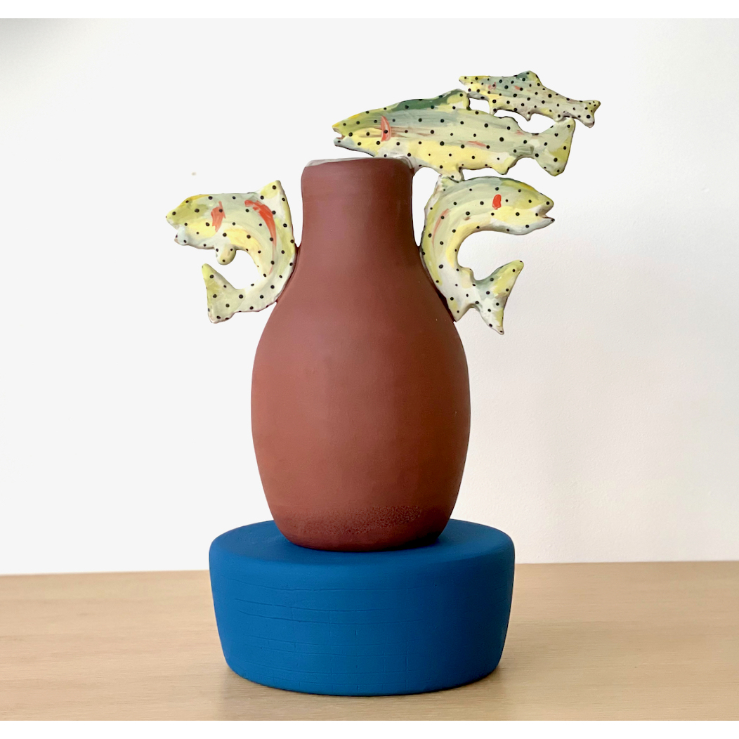 Wheel Thrown vessel with hand cut and painted winged handles with blue base.